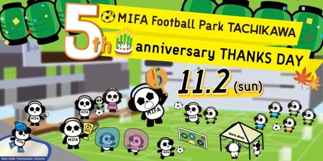 立川の人気サッカー施設「MIFA Football Park立川」が5周年を迎え、地域の皆さまへの感謝を込めた特別イベント「5th anniversary THANKS DAY」を開催します。普段は体験できないフットボールコンテンツや親子サッカー教室、プロ選手によるクリニックなど、子どもから大人まで無料で楽しめる1日限定のスペシャルプログラム。地域の家族や仲間たちが集い、スポーツの楽しさを共有できる感謝祭です。