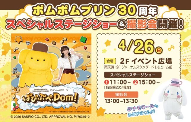 ポムポムプリン30周年を記念して開催されるイベントです。会場ではスペシャルステージショーのほか、当日条件を満たした方を対象に撮影会も実施されます。